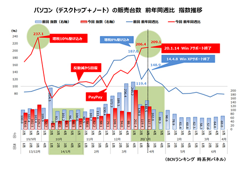 しかし、もう一つ気になるのは前回と今回の1月の比較だ。14年1月は指数が100前後で推移しているのに対して、20年1月はサポート終了の影響があるとはいえ、第1週は202.4、第2週は119.4、サポート終了後の第3週は117.5と二ケタ増で伸長している。1月の比較に限ってみれば、市場の規模は大きくなった。