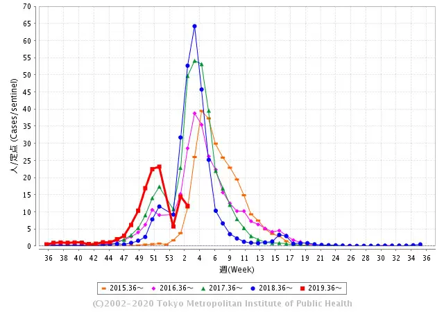 東京都感染症情報センターが1月22日に発表した「インフルエンザの流行状況」でも、2020年第3週(1月13日~1月19日)は前週より患者数が減少。例年であれば流行がピークを迎える時期だが、歴史的な暖冬の影響もあり患者数は抑えられている。