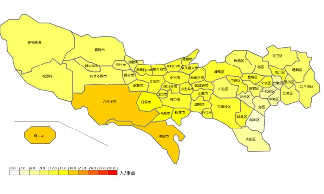 都内流行マップ・保健所別(マップは東京都感染症情報センターのホームページから抜粋)