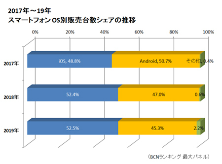 ご存知の通り、国内ではAppleのiPhoneシリーズが圧倒的な人気を誇る。家電量販店の実売データを集計する「BCNランキング」によると、2019年のiPhoneの販売台数シェアは51.9%(OS別でみると52.5%)と、ほぼ半数を占め、Androidは全機種合算しても45.3%と、差が開いている。しかも、Androidのシェアは下落傾向にあり、17年に比べ、19年は5.4ポイントもダウンした。