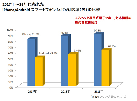 店頭で「Apple Pay/Google Pay」が使えるFeliCa対応機種の構成比は、iPhoneに限ると90.8%に達し、非対応のiPhone 6sでも、FeliCa搭載Apple Watchと組み合わせれば、Apple Watch上でモバイルSuicaを利用できる。対して、AndroidスマホのFeliCa対応機種の構成比は62.7%にとどまり、「HUAWEI P30 lite」などのFeliCa非搭載機種では、チップ自体が入っていないため、モバイルSuica/モバイルWAONなど、FeliCa技術を利用した国内の非接触決済サービスは全て利用できない。