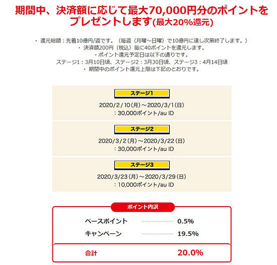 対象は、au PAY加盟店全て。つまり主要家電量販店でau PAYのコード支払いで対応すると、誰でも決済金額の20%(税込200円ごとに40ポイント)、最大合計7万円相当のポイントをゲットできる。キャンペーン分のポイントは2カ月以内に付与予定。