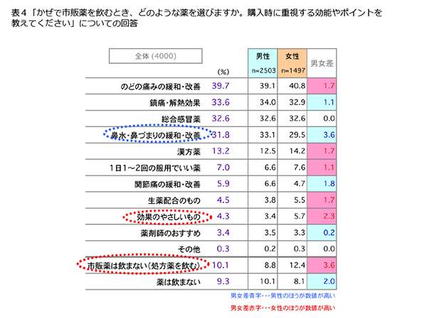 男女差に注目すると、最も差が大きいのが「鼻水・鼻づまりの緩和・改善」で男性の方が高いという。次いで差が大きい「効果のやさしいもの」は、女性が上回った。「漢方薬」や「生薬配合のもの」も女性の方が高く、女性が自然に近いものを選ぶ傾向がありそうだ。「市販薬は飲まない(処方薬を飲む)」も女性が上回っているとのことだ。