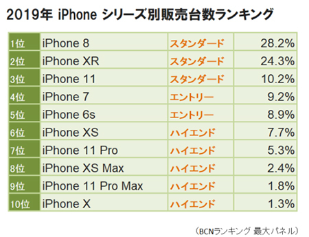 家電量販店の実売データを集計した「BCNランキング」の2019年の年間販売台数にもとづき、10月以前は安価だった「iPhone 8」や「iPhone XR」、最新機種の「iPhone 11」を全て「スタンダードモデル」に分類すると、19年のハイエンド・スタンダード・エントリーモデルの販売台数比率はおおむね「1:3:1」だった。