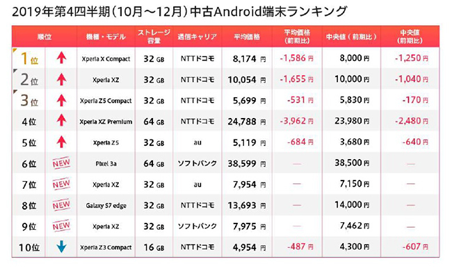 Androidスマホでは、前回から取引数が大幅に増加したのがGoogle Pixel 3aだった。ランクインしている多くの機種が16年以前に発売されたが、同機種は19年6月に発売された比較的新しい端末。十分な機能も備えている上に、平均取引価格も4万円弱であることから人気が高まったと推測されるとのことだ。