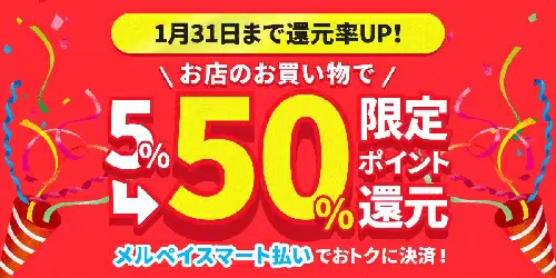 メルペイは、12月18日に開始した「メルペイスマート払い5%ポイント還元キャンペーン」の還元率を1月24日0時から50%に引き上げた。還元率アップ期間は1月31日23時59分まで。