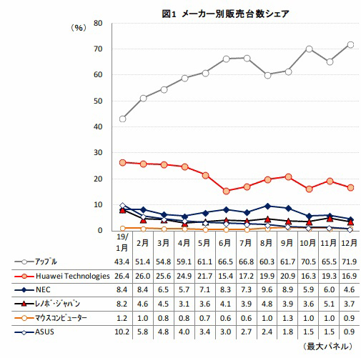 家電量販店・ネットショップの実売データを集計する「BCNランキング」によれば、19年1月に43.4%だったアップルの台数シェアは月を追うごとに上昇、12月には71.9%に達し、この一年で30ポイントも増加。なお、Windows 7のサポート終了(EOS)の追い風を受け、市場規模は大幅に拡大した。