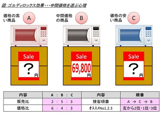 多くのメーカー・販売店は、客単価と成約率をアップするために、三つの価格帯を用意し、顧客に真ん中を選ぶように仕向けている。家電量販店の店頭やECサイトでよく見かける「おすすめベスト3」や、懐石弁当の「松竹梅」がまさにそれ。こうした展示手法は、イギリス童話の「3匹の熊」から「ゴルディロックス効果」と呼ばれる。