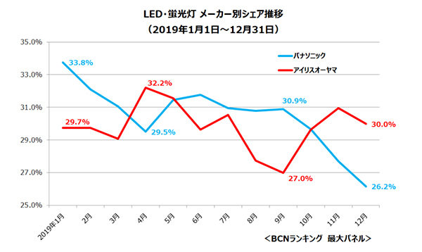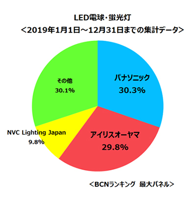 全国の主要家電量販店・ネットショップのPOSデータを集計した「BCNランキング」で年間販売台数No.1ベンダーを称える「BCN AWARD 2020(2019年1月1日~12月31日の集計データ)」で「LED電球・蛍光灯」部門のトップに輝いたのは販売台数シェア30.3%を獲得したパナソニックだった。2位のアイリスオーヤマ(29.8%)とは、わずか0.5ポイントの僅差だった。