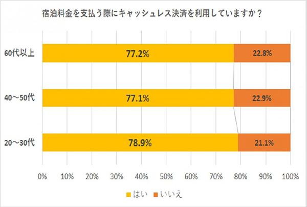 今回の調査の結果、キャッシュレス決済については60代以上のシニア層の94.6%が利用しており、そのうち77.2%のシニアは宿泊施設の決済時にキャッシュレス決済を利用していた。若年層だけでなく、多くの60代以上のシニア層も、クレジットカードを含めたキャッシュレス決済の手段をもち、宿泊料金支払う際に利用していることが分かった。