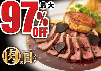 今回のフェアでは、こだわりのある肉料理を、肉の日だからこそ体験してほしいと「熟成赤身のロッシーニ」「レッドホットチキン」「焼き牛タン」の中から好きな1皿を特別価格29円(通常価格から最大97%オフ)で提供する。