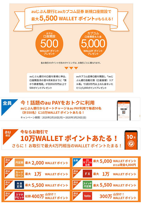 2019年12月9日に開始した新規口座開設キャンペーンをあわせ、計12件のキャンペーンを展開し、20年3月31日までに新規にauじぶん銀行・auカブコム証券の口座を開設し、所定の条件を満たし、対象となる8つのサービス・商品を利用した場合、最大で4万円相当のポイントをプレゼントする。