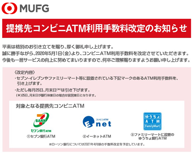 三菱UFJ銀行は、2020年5月1日からコンビニATM利用手数料を改定する。全体的にATM利用手数料を引き上げる一方で、毎月25日と月末日(ともに銀行休業日の場合は前営業日)は、日中の8時45分~18時に限り、無料化する。