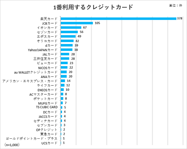 お金の情報サイト「まねーぶ」が実施した全国20~60代のクレジットカード(クレカ)保有者1000人を対象にインターネットで実施した利用調査によると、もっとも利用されているクレカは「楽天カード」の378件で、回答者の3人に1人が選んでいた。2位はJCBカード(105件)、3位はイオンカード(67件)、4位はセゾンカード(56件)となり、上位4種で全体の6割を占めた。