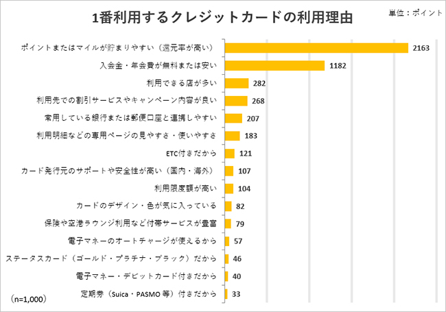 クレカの利用でもっとも重視することへの質問では「ポイントまたはマイルの還元率が高い」が2163ポイント、次いで「入会金・年会費が無料または安い」が1182ポイントと、倍近いポイント差をつけた。