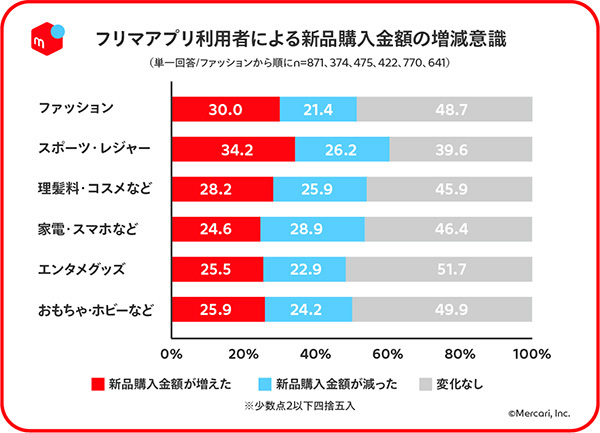 フリマアプリ利用者1500人に、フリマアプリを利用することで新品購入額が増減したかを定性的に評価してもらうと、6カテゴリ中5カテゴリで「新品購入金額が増えた」と感じている人が多いという結果になった。前述調査の金額での分析結果と、消費者の主観的な評価はおおむね整合性が取れていることが分かった。