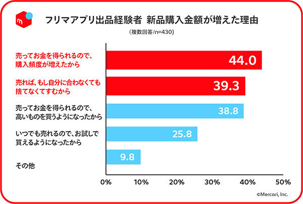 フリマアプリで出品経験があり、新品購入金額が増加したと回答した人を対象に増えた理由を調査すると、最も多い回答は「売ってお金を得られるので、購入頻度が増えたから」(44.0%)だった。一方で、「売却できるから新品購入ハードルが下がる」という意見もあることが分かった。