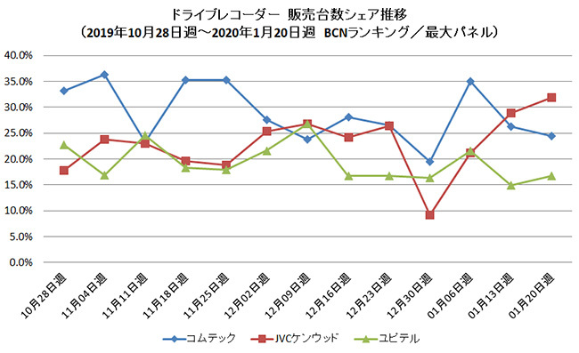 メーカー別では、JVCケンウッドが25.7%の販売台数シェアを獲得し、コムテック(21.7%)を半年ぶりに逆転した。週次で推移を追うと、JVCケンウッドは前半こそ大きくシェアを落としたものの、右肩上がりに数字を上げ、1月13日週にコムテックを抜いた。