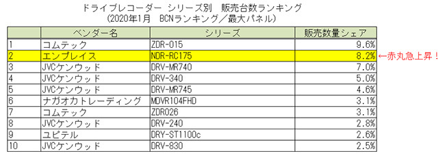 シリーズ別の販売台数シェアランキングは、コムテックの「ZDR-015」が安定の1位。注目は、エンプレイスの「NDR-RC175」が2位にジャンプアップしていることだ。同モデルは、2カメラタイプながら1万円前後のお手頃価格を実現。コスパの良さから、ユーザーに支持されたようだ。(BCN・大蔵 大輔)
