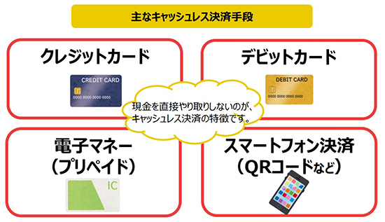 まずは、日本で最も普及しているキャッシュレス決済のクレジットカード。最大の特徴は、決済方法に「後払い方式」を採用している点で、商品を購入する時点で現金はもちろん、預金がなくても支払うことができる。ただ、カード発行には与信審査が必要で、基本的に返済能力のある人だけが利用できるようになっている。