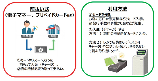 電子マネーやプリペイドのキャッシュレス決済は、事前にお金をチャージする「前払い方式」となっている。具体的には、専用のカードやスマホが財布代わりとなり、1万円チャージすれば1万円分の買い物ができる仕組みだ。