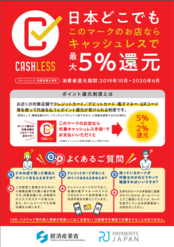では、キャッシュレス・ポイント還元事業のポイント還元率も、おさらいしておこう。対象店舗で登録されたキャッシュレス決済を利用すると、5%または2%のポイント還元を受けることができる。なお、期間は2020年6月末までだ。具体的に、5%還元が中小・小規模事業者、2%還元がフランチャイズやチェーン店となっている。