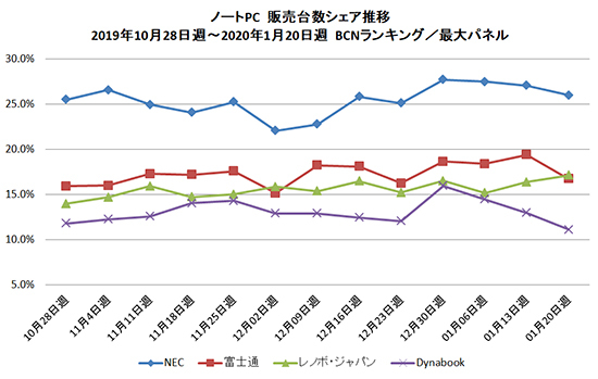 メーカー各社の売れ行きも市場全体のトレンドを受け、軒並み好調に推移。前年比200%を超えたのはNEC、レノボ、Dynabookだった。週次で販売台数の推移を追うと、目立つのがレノボの躍進だ。1月20日週には富士通を抜き、2位に立った。