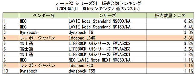 シリーズ別ランキングでは、NECの「LAVIE Note Standard NS600/NA」がトップ。プロセッサーにAMD Ryzen 7を採用したモデルで、コスパのよさも魅力となっているようだ。存在感が高まっているレノボの売れ筋は「Ideapad L340」。NECの「LAVIE Note Standard NS600/NA」、Dynabookの「dynabook T6」に次ぐ4位にランクインした。(BCN・大蔵 大輔)