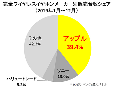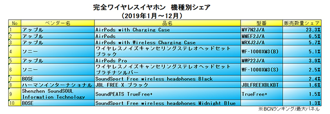 全国の主要家電量販店・ネットショップのPOSデータを集計した「BCNランキング」によると、完全ワイヤレスイヤホンの2019年(1月~12月)メーカー別シェアでNO.1に輝いたのはアップルだった。けん引したのはAir Podsシリーズ。機種別では「AirPods with Charging Case」がトップで、23.3%を獲得し唯一の2ケタシェアとなった。