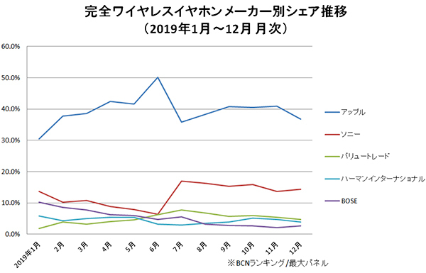 19年の年間機種別ランキングをみると、4位と6位にソニーの「WF-1000XM3」がランクインしている。ソニーが7月に発売したノイズキャンセリング搭載の完全ワイヤレスイヤホンで、メーカーシェア拡大を後押しした。音質の良さ、快適な装着感、使いやすさが好評を得ている。