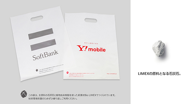 ソフトバンクでは、地球環境保護への取り組みとして「ソフトバンク」と「ワイモバイル」の携帯電話取扱店で、顧客にカタログなどを渡す際に使用しているプラスチック製手提げ袋について、紙袋など代替素材への切り替えを検討してきた。19年12月から、全国の直営店や神奈川県と福井県の一部店舗でLIMEX製品の試験導入を実施し、石油由来プラスチックの使用量を削減できる環境性能に加えて、プラスチック製品と変わらない十分な耐久性、柔軟な手触りなどを評価した結果、今回、全店舗での導入に至った。