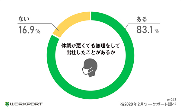 一方で、ワークポートが全国の転職希望者243人を対象に2月3~10日に実施したアンケート調査では、無理して出社したことが「ある」との回答が83.1%に上った。「ない」は16.9%だった。