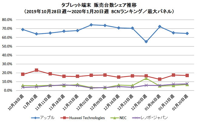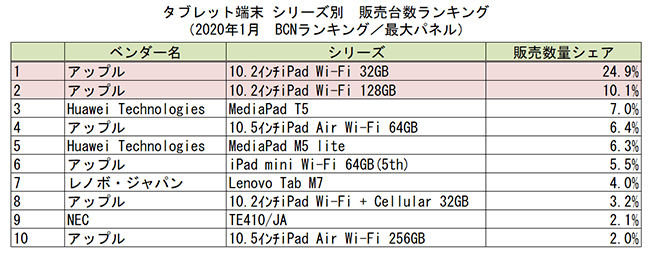 シリーズ別では「iPad 10.2インチ 第7世代 Wi-Fiモデル」が首位をキープ。32GBモデル+128GBモデルを合わせて約半分のシェアを占めた12月よりは数字を落としたものの、依然として35.0%の高シェアを維持している。Android勢はファーウェイの「MediaPad T5」が3位にランクイン。レノボの「Lenovo Tab M7」も7位と健闘している。(BCN・大蔵 大輔)