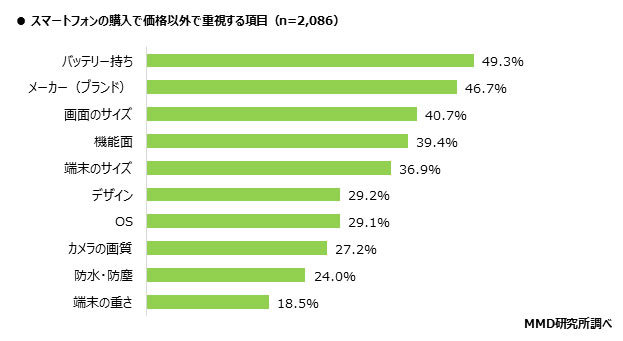 スマートフォンの購入で価格以外に重視している項目を複数回答で聞いたところ、「バッテリー持ち」が49.3%と最も多く、次いで「メーカー(ブランド)」で46.7%、「画面のサイズ」が40.7%となった。