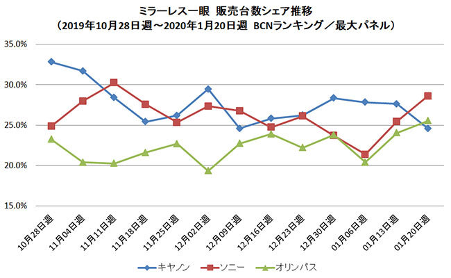 メーカー別ではソニーが2019年7月以来、半年ぶりに販売台数シェアでキヤノンを抜いた。週次の販売台数シェア推移では、1月の第1~3週はソニーが30%近くのシェアで首位をキープ、第4週はキヤノンとオリンパスが勢いを取り戻し、ソニーを上回った。