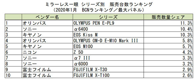 シリーズ別ランキングでは、オリンパスの「OLYMPUS PEN E-PL9」が急上昇。首位の常連であるキヤノンの「EOS Kiss M」やソニーの「α6400」を僅差で抑えて首位に立った。販売台数が前年比109.3%と好調な富士フイルムの「FUJIFILM X-T30」と「FUJIFILM X-T100」がベストテン入りを果たしたことにも注目だ。(BCN・大蔵 大輔)
