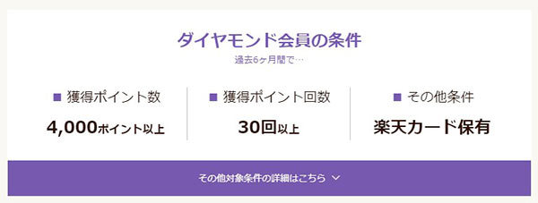 楽天会員はダイヤモンド/プラチナ/ゴールド/シルバー/ランクなしの5ランクに分かれ、最上位のダイヤモンド会員の条件は、過去6カ月間で「獲得ポイント数4000ポイント以上」「獲得ポイント回数30回以上」「楽天カード保有」の三つ。楽天モバイル契約者は、SPUによって「楽天市場」の買い物のポイント付与倍率が「+2倍」となるため、日常的に楽天市場で買い物するだけで一度上がったランクはキープしやすいと思われる。