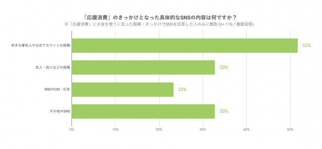 SNSと回答した人に、さらに具体的な経緯・きっかけを聞いてみると、過半数に当たる52%が「好きな著名人や公式アカウントの投稿」と回答。著名人や公式アカウントの投稿は、応援消費を生み出す大きな影響となっているようだ。また、次に多かったのは「友人・知人などの投稿(33%)」で、身近な情報発信も応援消費の経緯・きっかけに影響していることが分かった。