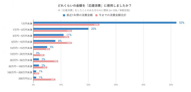 続いて、応援消費をしたことがある人に対して、どのくらいの金額を応援消費に使用したか聞いてみると、直近1年間では「1万円未満」が最も多い結果となった。また、これまでの総額でも1万円未満が最も多い一方で、「200万円以上」との回答も8%いた。