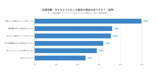 応援消費を始めたきっかけで最も多かったのは「応援したい対象がいた(できた)から(50%)」だった。次に多かった理由は「趣味趣向が合う対象があったから(36%)」「同じ価値観を有する対象があったから(32%)」「思いやメッセージに共感できたから(29%)」など、いずれも「共感できること」が重要な理由の一つという。
