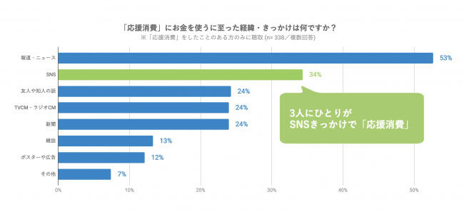 応援消費にお金を使うに至った経緯・きっかけを聞いてみたところ、最も多かったのが「報道・ニュース」で、全体の53%。また、3人に1人(34%)が経緯・きっかけに「SNS」を挙げていた。