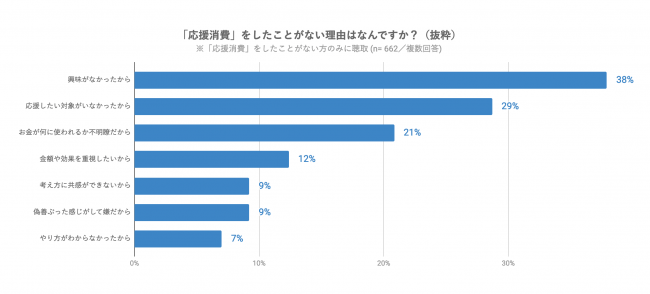 一方、応援消費をしたことがない理由では、「興味がなかったから(38%)」「応援したい対象がいなかったから(29%)」「お金が何に使われるか不明瞭だから(21%)」といった理由に多く票が集まった。