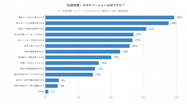 応援消費のモチベーションについては、全体で最も多く挙げられたのが「結果として自分の活力になる(39%)」。「役に立っている実感を得られること(38%)」「恩返しや好意の伝達ができる(31%)」が続いた。「成長や復興を見守れる(23%)」や「参加感や一体感を感じられる(20%)」「動向や効果等がわかる(15%)」という回答も一定数あったという。
