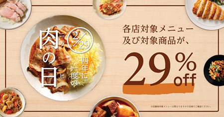 平田牧場は、2月29日の“4年に一度の肉の日”を記念して、対象店舗で「4年に一度の肉の日!29%OFFキャンペーン」を期間限定で実施する。