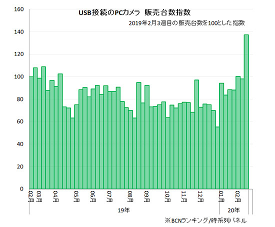 同店の奈良井亮一店長代理は、「テレワーク関連の製品で伸びているのは、PCカメラ。平時よりもかなり多く売れている」と話す。全国の主要家電量販店・ネットショップのPOSデータを集計した「BCNランキング」で、USB接続のPCカメラの2019年2月3週目の販売台数を100とした指数で表すと、2月3週目は137.4。それまでは110を超えていなかったことを踏まえると、同時期だけPCカメラの需要が突出して多いと分かる。