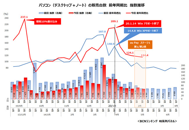 BCNランキングのデスクトップとノートを合算したPCの週次の販売台数は、消費増税の駆け込み需要で昨年9月第4週に前年比237.1%を記録。その後も、20年1月のWindows 7の駆け込み需要で再び1月第3週に209.1%のピークを形成した。