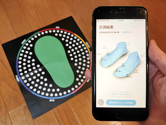 撮影はガイドに指示されたカラーとマットのカラーをカメラに合わせ、ぐるっと足元の周りをなぞっていく。音声案内もあり、完了するとチェックマークが出るので、手順で迷うことはないと思う。片方の足が終わったら、もう片方を計測。2~3分程度で完了する。