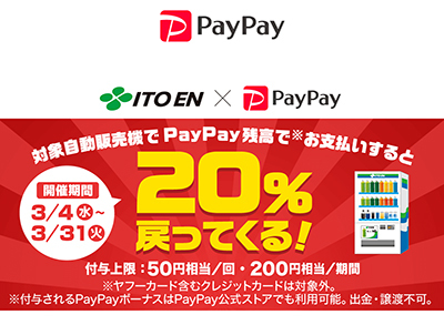 3月の「いつもどこかでワクワクペイペイ」として実施される「伊藤園の対象自販機で最大20%戻ってくるキャンペーン」は、伊藤園の自動販売機のうち、PayPayの支払いに対応している自動販売機が対象。全国で約4000台あるという。全PayPayユーザーが20%還元の恩恵を受けることができる。PayPay残高で支払うことが条件で、クレジットカードは対象外。付与上限は50円相当/回、200円相当/期間だ。