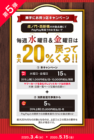 3月4日からは、「勝手にお得っ区キャンペーン」第5弾も同時に始まる。期間は5月15日まで。毎週水曜日と金曜日は、虎ノ門、西新橋の対象店舗でPayPay残高での支払いで最大20%が戻ってくる。基本の還元は15%で、付与上限は1000円相当/回、1万円相当/期間。ポイント還元事業の5%還元対象店舗なら合計20%還元になる。このキャンペーンもPayPayに登録したクレジットカードは対象外なので注意したい。