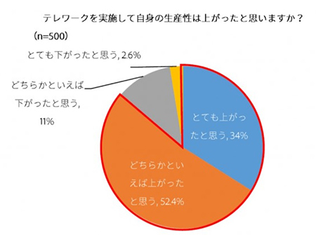 テレワークを実施して、自身の生産性は上がったと思うかを聞いたところ、86.4%のビジネスパーソンが、生産性が上がったと感じているという。また、テレワークを実施してペーパーレス化が進んだかどうか聞いたところ、84.8%が「ペーパーレス化が進んだ」と回答したとのことだ。